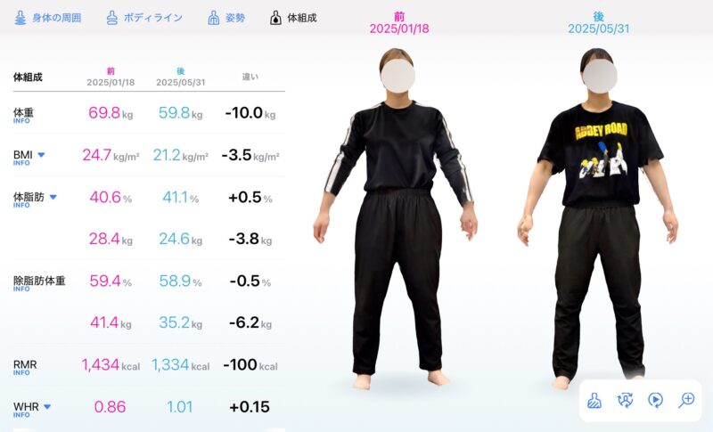 体脂肪の数値は、お洋服の関係でしっかりとした数値を計測することができなかったですが、見た目は非常にスラっとしました!